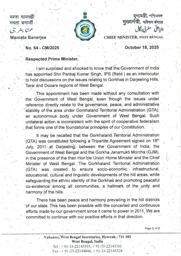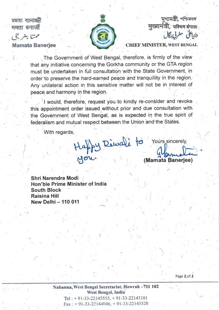 पत्र में मुख्यमंत्री ने लिखा, ‘पश्चिम बंगाल सरकार का दृढ़ विश्वास है कि गोरखा समुदाय या जीटीए (गोरखालैंड प्रादेशिक प्रशासन) क्षेत्र के संबंध में कोई भी पहल राज्य सरकार के पूर्ण परामर्श और सहयोग से ही की जानी चाहिए। ताकि लंबे प्रयासों से स्थापित क्षेत्र की शांति और स्थिरता अक्षुण्ण बनी रहे। ’