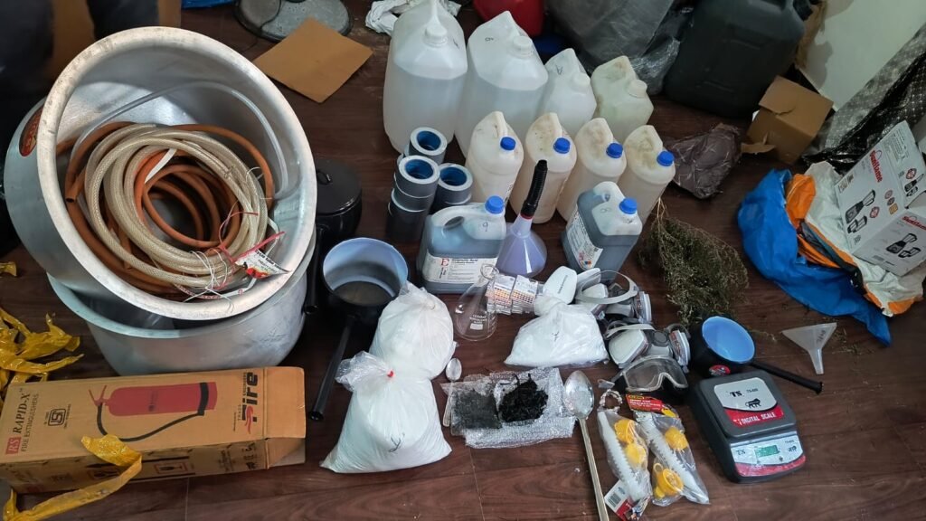 नयी दिल्ली :डायरेक्टरेट ऑफ रेवेन्यू इंटेलिजेंस (DRI) ने दिल्ली-एनसीआर में बड़ी कार्रवाई करते हुए एक अंतरराष्ट्रीय ड्रग्स नेटवर्क को ध्वस्त कर दिया है। यह अभियान 21 से 23 अक्टूबर तक चलाया गया। इस दौरान ड्रग्स बनाने की फैक्ट्री और सप्लाई चैन को निशाना बनाकर बड़ी मात्रा में नशा बरामद किया गया।