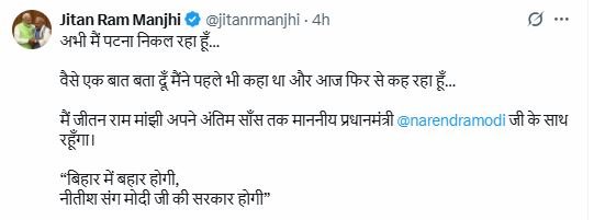 जीतन राम मांझी ने एक बड़ा बयान देकर तमाम राजनीतिक अटकलों पर विराम लगा दिया है। उन्होंने स्पष्ट किया है कि वह पूरी तरह से एनडीए के साथ हैं और अंतिम समय तक प्रधानमंत्री नरेंद्र मोदी का साथ नहीं छोड़ेंगे। मांझी ने सोशल मीडिया पर दिए अपने बयान में कहा, मैं जीतन राम मांझी अपने अंतिम सांस तक प्रधानमंत्री नरेंद्र मोदी जी के साथ रहूंगा। जीतन राम मांझी यहीं नहीं रुके, उन्होंने बिहार के भविष्य की तस्वीर साफ करते हुए एक नारा भी दिया। उन्होंने लिखा, बिहार में बहार होगी, नीतीश संग मोदी जी की सरकार होगी. इस नारे के जरिए उन्होंने स्पष्ट कर दिया है कि वह बिहार में मुख्यमंत्री नीतीश कुमार और प्रधानमंत्री नरेंद्र मोदी के नेतृत्व वाले गठबंधन के साथ मजबूती से खड़े हैं.