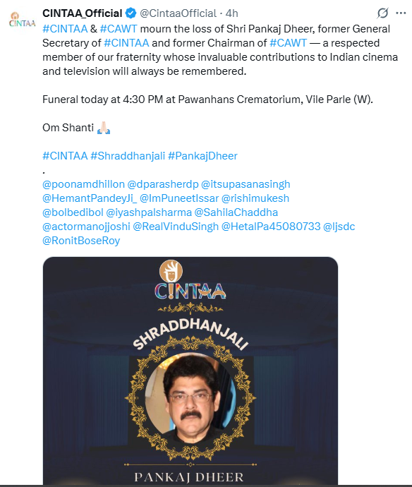 CINTAA ने अपने सन्देश में कहा कि “गहरे शोक और दुःख के साथ हम सूचित करते हैं कि हमारे ट्रस्ट के पूर्व चेयरमैन और CINTAA के पूर्व माननीय महासचिव पंकज धीर जी का 15 अक्टूबर 2025 को निधन हो गया। उनका अंतिम संस्कार आज शाम 4:30 बजे, पवन हंस, विले पार्ले (पश्चिम), मुंबई के पास किया जाएगा।”