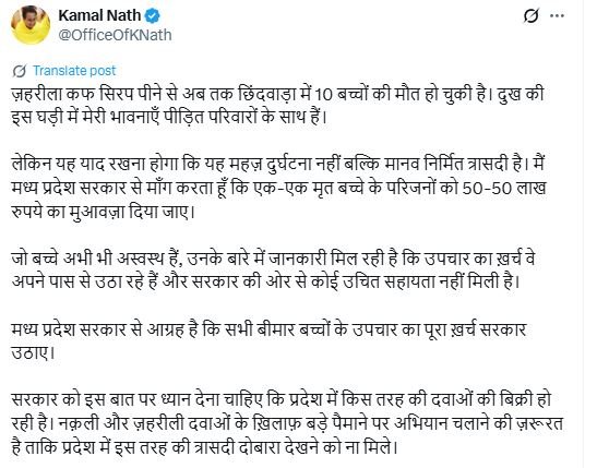 छिंदवाड़ा में 10 मासूमों की मौत पर पूर्व सीएम कमलनाथ ने X पर लिखा