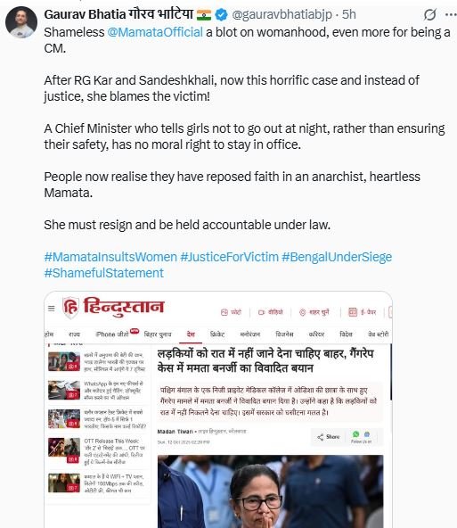 उनकी टिप्पणी पर तीखी प्रतिक्रिया देते हुए, भाजपा के राष्ट्रीय प्रवक्ता गौरव भाटिया ने एक्स पर लिखा, “बेशर्म @ममताऑफिशियल, नारीत्व पर एक कलंक, और एक मुख्यमंत्री होने के नाते तो और भी बड़ा।” उन्होंने आरोप लगाया, “आरजी कार और संदेशखाली के बाद, अब बलात्कार का यह भयावह मामला और न्याय के बजाय, वह पीड़िता को ही दोषी ठहरा रही हैं।”