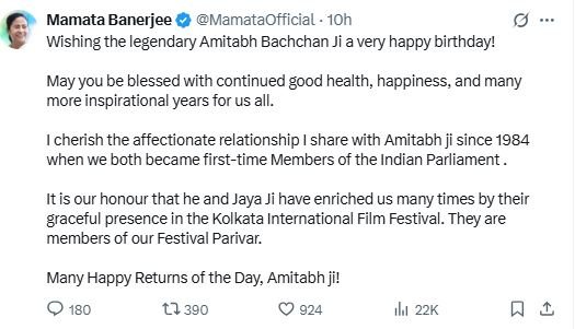 अपने रिश्ते पर प्रकाश डालते हुए और उन पर अपना प्यार बरसाते हुए, मुख्यमंत्री ममता बनर्जी ने लिखा, “महान अमिताभ बच्चन जी को जन्मदिन की बहुत-बहुत शुभकामनाएँ! आपको निरंतर अच्छा स्वास्थ्य, खुशी और हम सभी के लिए कई प्रेरणादायक वर्ष प्रदान करें।”