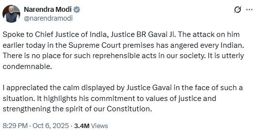 पीएम नरेन्द्र मोदी ने अपने सोशल मीडिया एक्स पर लिखा कि–भारत के मुख्य न्यायाधीश, न्यायमूर्ति बी.आर. गवई जी से बात की। आज सुबह सुप्रीम कोर्ट परिसर में उन पर हुए हमले से हर भारतीय क्षुब्ध है। हमारे समाज में ऐसे निंदनीय कृत्यों के लिए कोई जगह नहीं है। यह अत्यंत निंदनीय है। ऐसी स्थिति में न्यायमूर्ति गवई द्वारा प्रदर्शित धैर्य की मैं सराहना करता हूँ। यह न्याय के मूल्यों के प्रति उनकी प्रतिबद्धता और हमारे संविधान की भावना को मज़बूत करने की उनकी प्रतिबद्धता को दर्शाता है।