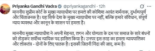 प्रियंका गांधी ने अपने सोशल मीडिया एक्स पर लिखा कि–माननीय सुप्रीम कोर्ट के मुख्य न्यायाधीश पर हमले की कोशिश अत्यंत शर्मनाक, दुर्भाग्यपूर्ण और चिंताजनक है। यह सिर्फ देश के मुख्य न्यायाधीश पर नहीं, बल्कि हमारे संविधान, संपूर्ण न्याय व्यवस्था और कानून के शासन पर हमला है। माननीय मुख्य न्यायाधीश ने अपनी मेहनत, लगन और योग्यता के दम पर समाज के सारे बंधनों को तोड़कर सर्वोच्च न्यायिक पद हासिल किया है। उनपर इस तरह का हमला न्यायपालिका और लोकतंत्र – दोनों के लिए घातक है। इसकी जितनी निंदा की जाए, कम है।