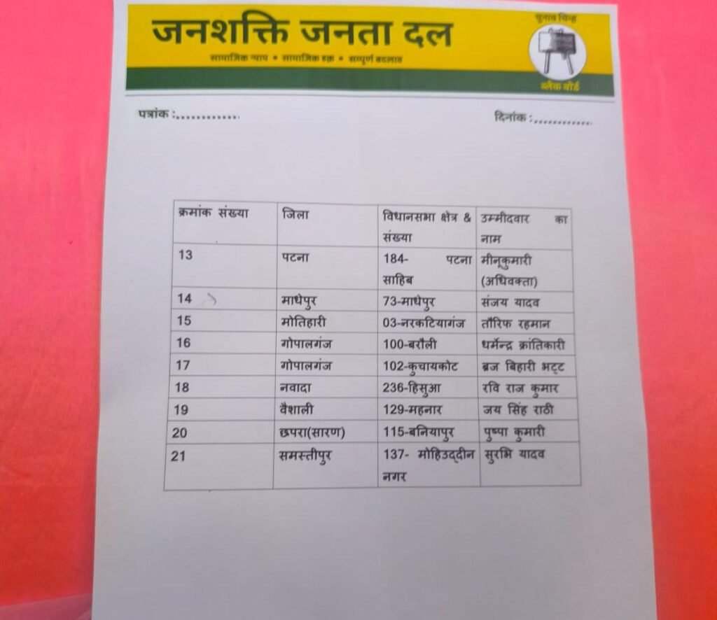 बख्तियारपुर से तेजस्वी के करीबी अनिरुद्ध यादव विधायक हैं। उनके ख़िलाफ़ भी तेजप्रताप ने उम्मीदवार घोषित किए हैं। मधेपुरा से पूर्व शिक्षा मंत्री चंद्रशेखर के खिलाफ भी तेजप्रताप ने उतारे अपने उम्मीदवार। पहली लिस्ट में राघोपुऱ विधानसभा का नाम नहीं है। तेजप्रताप ने RJD के प्रत्याशियों के खिलाफ उतारे उम्मीदवार।